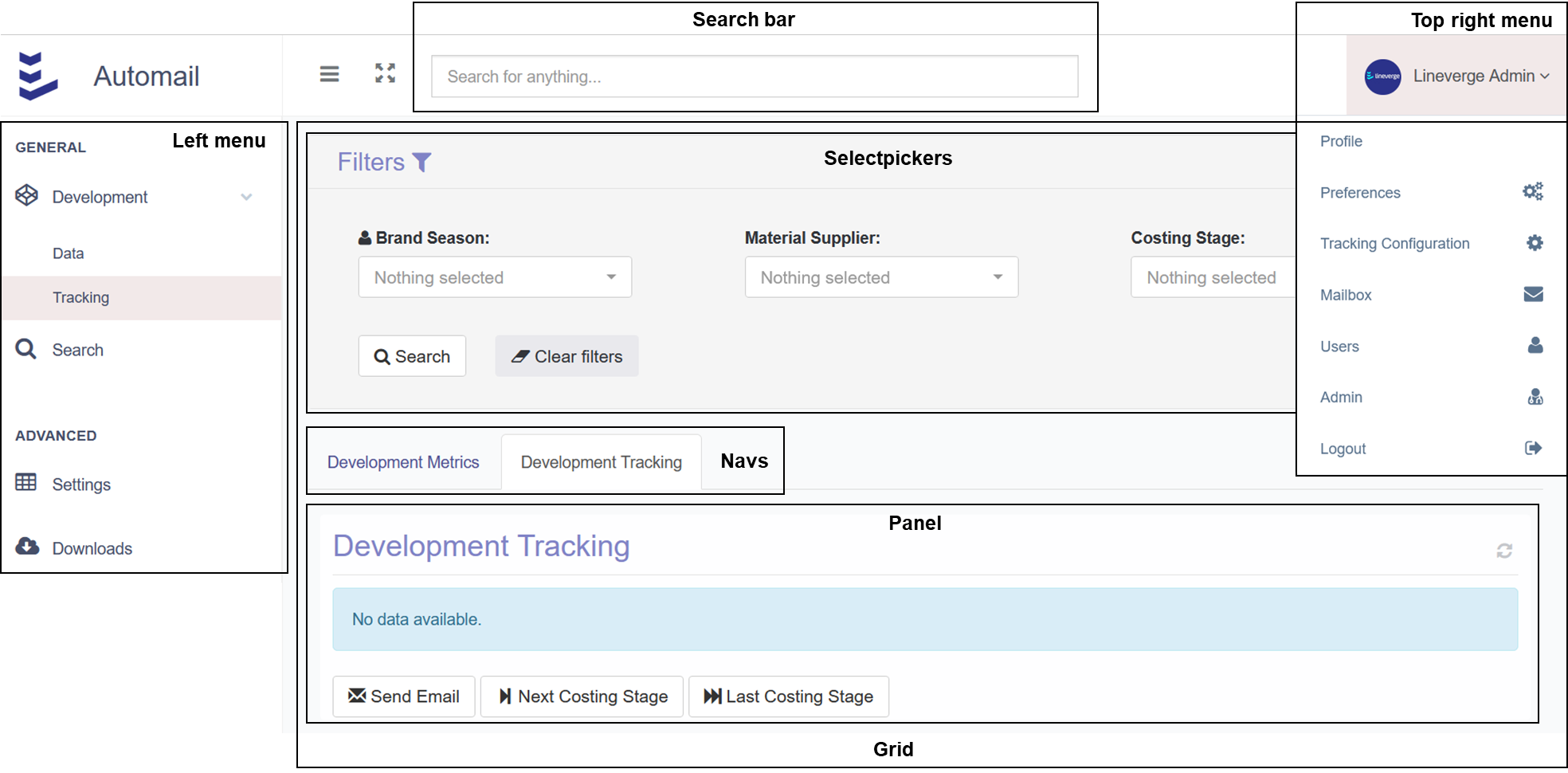 The interface of Automail consists of a left menu (up to 3 levels of submenus), a top menu with a search bar + a dropdown on the right side, and the content.